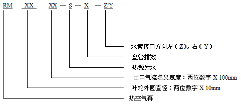 表示叶轮外圆直径为150mm,出口气流名义宽度为1500mm,盘管为3排,热媒为水的贯流式热空气幕。